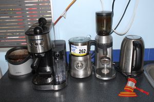 Coffee Bundle including: Espresso Machine, Coffee Bean Grinder, Frother, Grounds Container and Cordless Kettle, Electric 240V Plugs