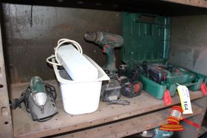 2 Door Metal Storage Cupboard, Approx: 900mm x 400mm x 1800mm, with contents including: 3 x Bosch Drills, Hitachi Angle Grinder, Ryobi Angle Grinder, XU1 Angle Grinder, Cordless Hyundai Reciprocating Saw and Circular Saw (No Batteries), Ryobi Mini Planer, Makita and GBOS Heat Guns, 3 x Soldering Irons, Mini Press, 3 x Die Grinders and other Miscellaneous Items